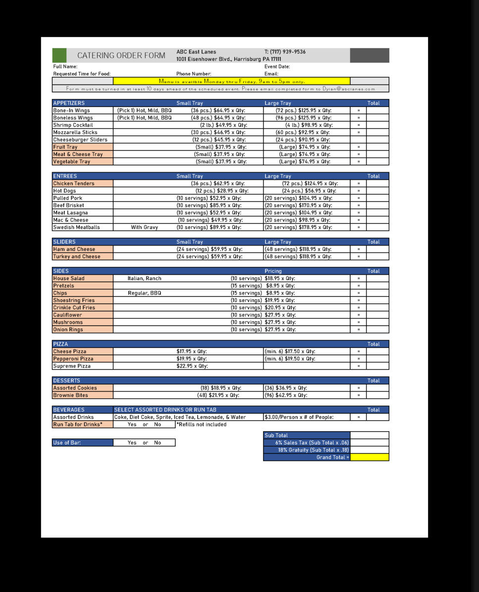 Catering order forms must be returned 10 days prior to your scheduled event.